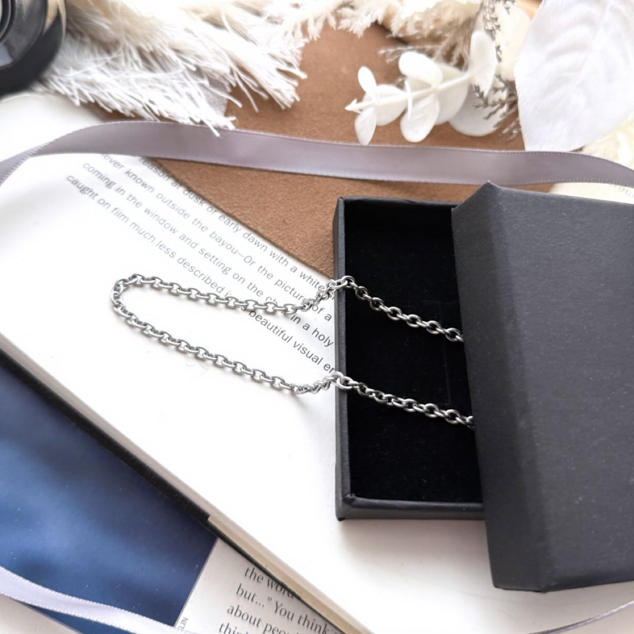 落ち着きのあるシルバーの色味に加え、流行に左右されないあずきチェーンで存在感のある一品です。