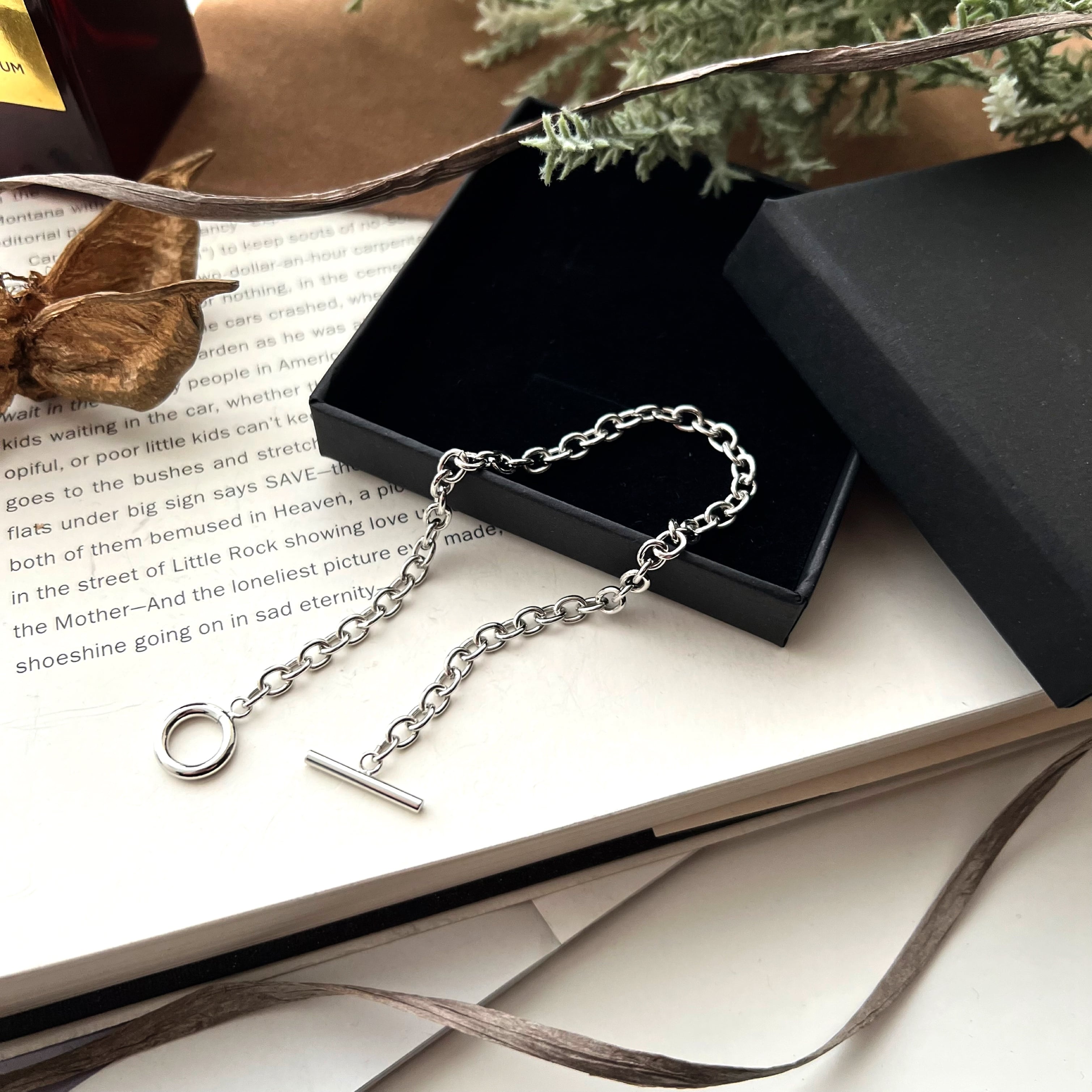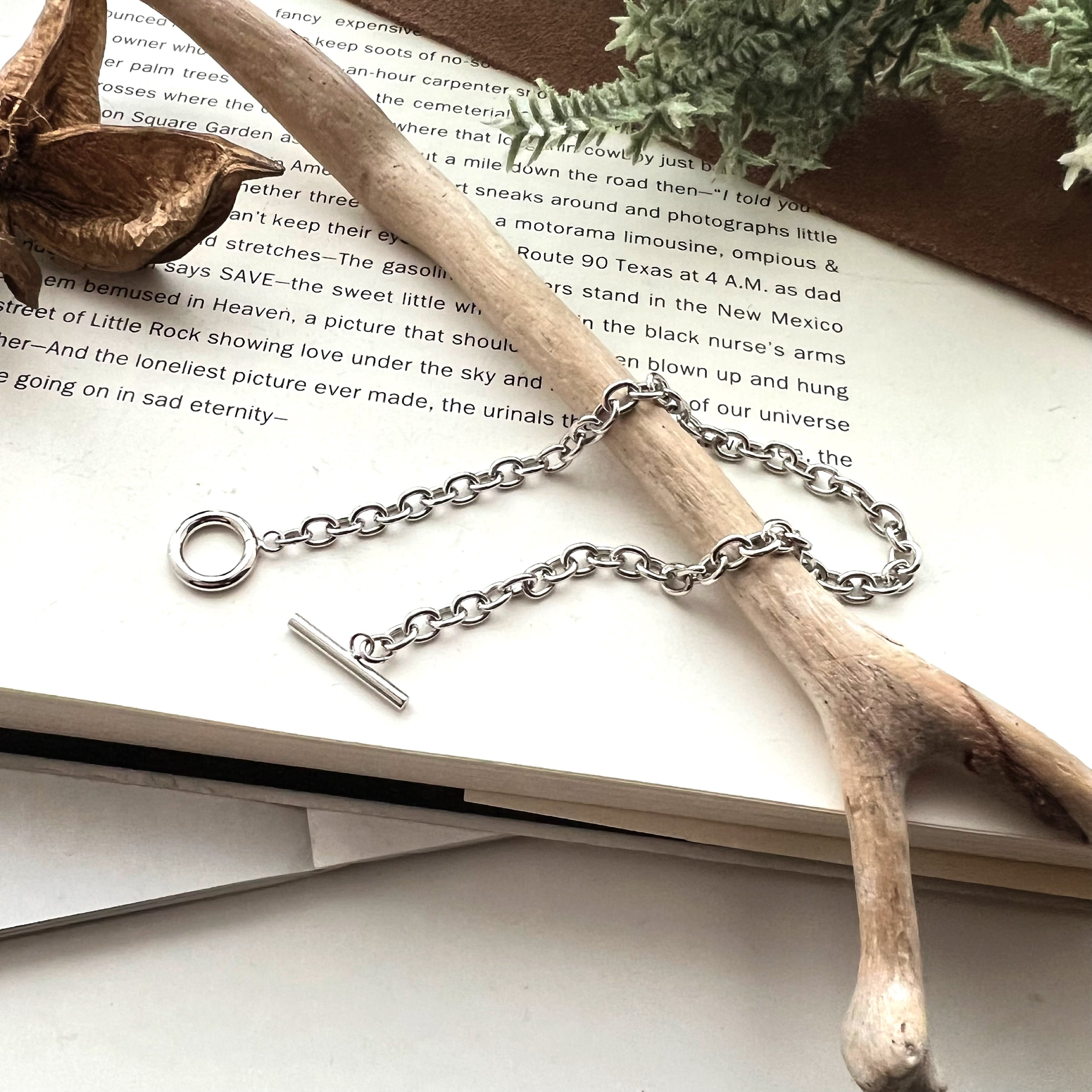 シルバーの輝きを放つシンプルデザインのチェーンブレスレット。