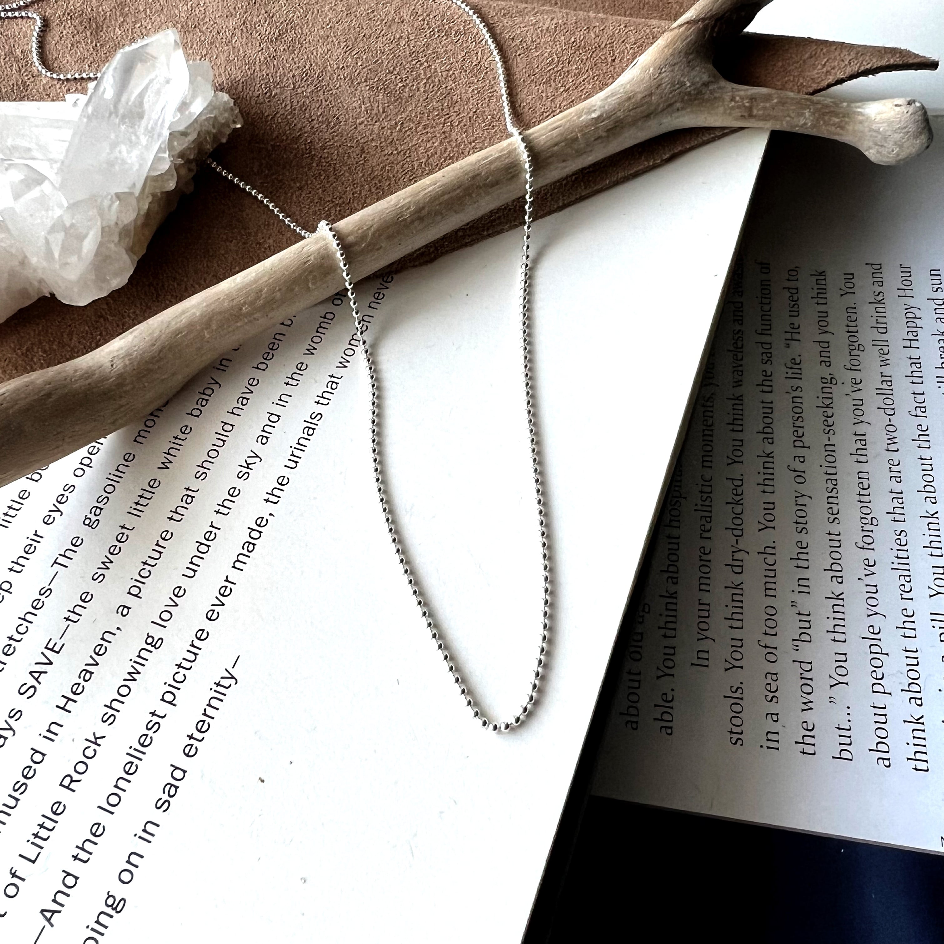 シルバーの輝きを放つ極細のボールチェーンはさまざまなスタイルに合わせやすく、